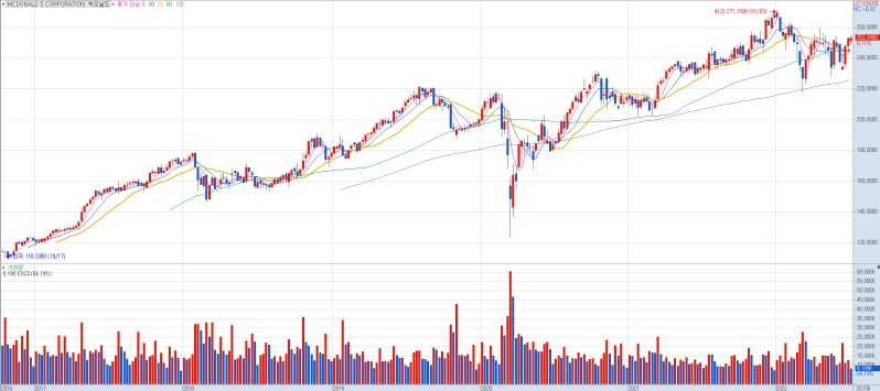 또한 맥도날드의 사업 구조는 단순히 프랜차이즈를 부여하고 로열티를 받는 것이 아니라 부동산 소유를 기반으로 하고 있으므로 상승 추세를 보이며 영업이익이 증가하는 효과가 있어 지속적인 주가 모멘텀을 제공하고 있습니다.