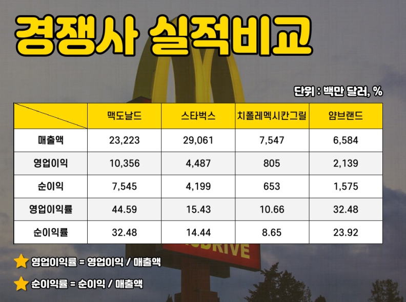 맥도날드의 경쟁사를 보면 스타벅스, 치폴레 멕시칸 그릴, 얌 브랜드 등이 있습니다.