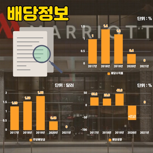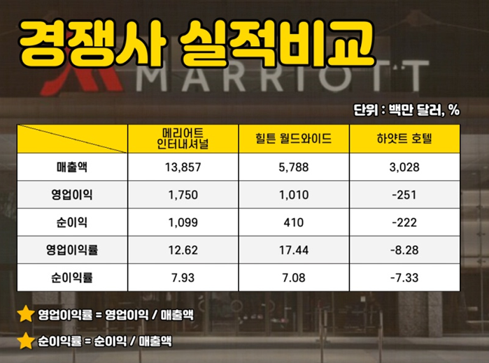 2017년부터 2021년까지의 손익계산서를 보면 2019년까지 3년 연속 안정적인 매출을 유지해온 메리어트가 2020년 매출이 절반으로 줄었고, 순이익은 적자전환해 큰 폭의 하락세를 보였습니다.