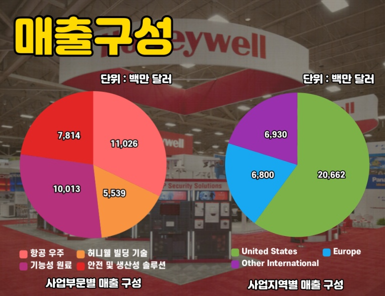 2020년에는 코로나바이러스 때문에 주가가 하락하고 매출이 큰 타격을 받았지만 허니웰은 비즈니스 제트기를 만드는 사업을 하고 있었고 이 사업이 일반 여객기보다 더 안정적이고 마진이 높은 사업으로 평가되었기 때문에 2021년에는 매출의 빠른 회복이 이루어졌습니다.