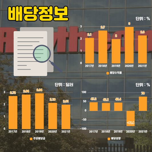 2021년 기준 배당수익률은 2.3%, 주당 배당금은 2.01달러, 배당성향은 78%로 배당 성장이 멈췄습니다.