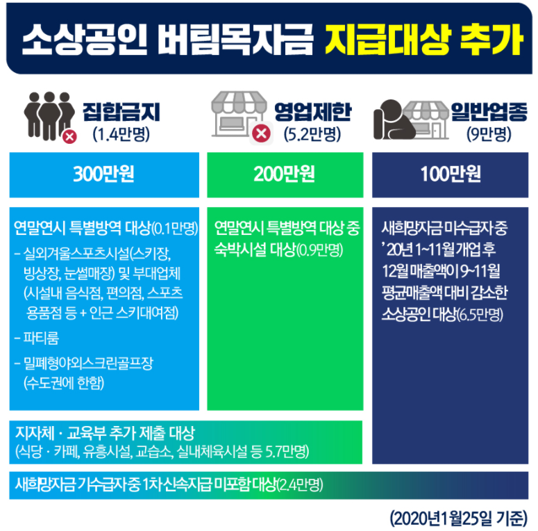 11월 24일 이후 정부와 지방자치단체의 방역 강화조치로 인해 집합금지업 영업제한이 된 업종별 소상공인에게 각각 300만원과 200만원을 지급하는 제도입니다.