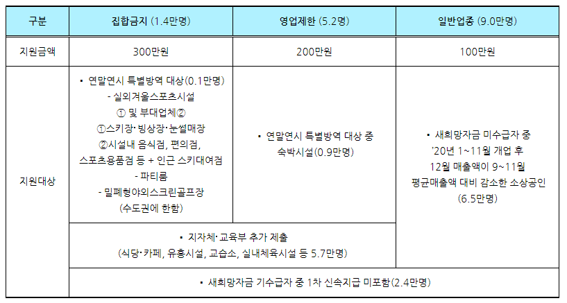 집합금지업종은 300만원, 영업제한업종은 200만원, 일반업종은 100만원씩 지급합니다.