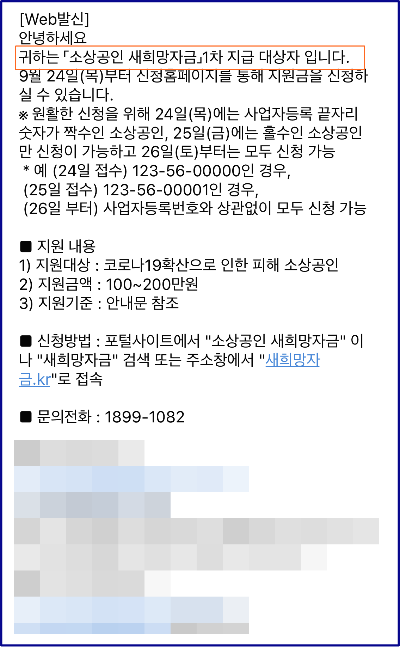 신속한 지급을 위해서 정부는 9월 23일부터 소상공인 새 희망자금 문자발송을 시작했다고 합니다.