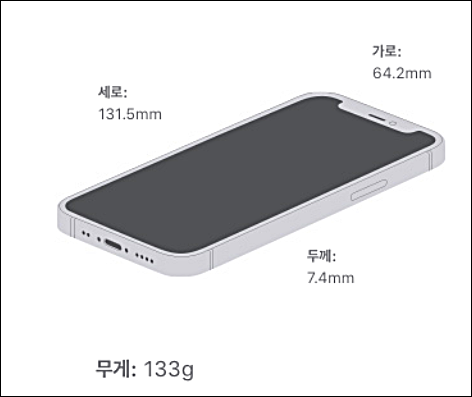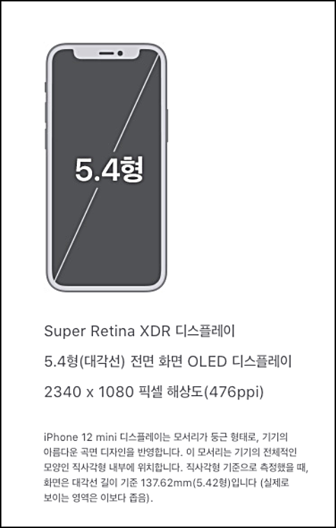 아이폰 12 미니는 5.4형 (대각선) 전면 화면인 OLED 디스플레이로 2340X1080 pxl 해상도 (476 ppi),