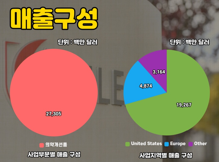 먼저 길리어드사이언스의 매출 구조를 보면 모든 매출이 단일 의약품 개선 제품 부문에서 나온다는 것을 알 수 있습니다.