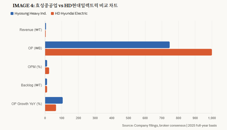 동종 업계와 비교하면 어떨까. HD현대일렉트릭은 2025년 매출 4.06조 원, 영업이익 1조 원을 기록하며 영업이익률 약 25%를 달성했다. LS일렉트릭은 매출 6.76조 원에 영업이익 2,745억 원으로 영업이익률 4.1% 수준이다. 효성중공업의 연결 기준 영업이익률은 12.5%인데, 이건 건설 부문이 섞여 있어서 낮아 보이는 것이다. 중공업 부문만 떼어보면 2025년 연간 영업이익률이 15.5%, 4분기 단독으로는 20.2%로 HD현대일렉트릭과 어깨를 나란히 한다.