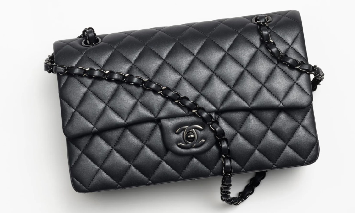 - 샤넬 디자인: 클래식 백은 블랙 램스킨(양 또는 소가죽)과 고급스러운 교차 직조