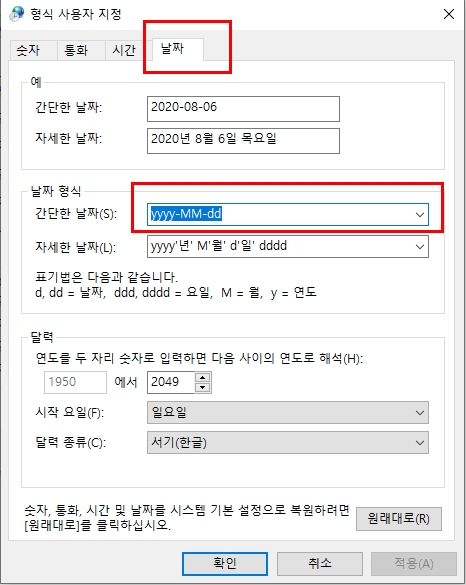 상단에 날짜 클릭 "날짜형식" 칸에서