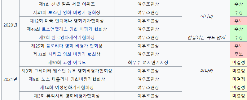 윤여정은 LA , 보스턴, 노스캐롤라이나 , 오클라호마, 콜럼버스, 그레이터 웨스턴 뉴욕, 샌디에이고, 뮤직시티, 샌프란시스코, 세인트루이스, 디스커싱필름 비평가협회와 미국 여성 영화기자협회, 선셋 필름 서클 어워즈 각 여우조연상을 석권했습니다.