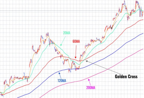 장기 이동 평균이 단기 이동 평균과 교차 및 상승하는 경우를 '골든 크로스'라고 합니다.