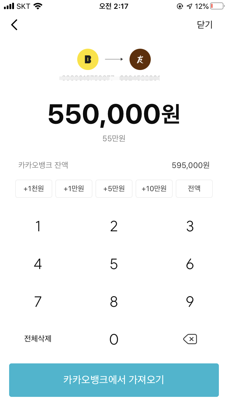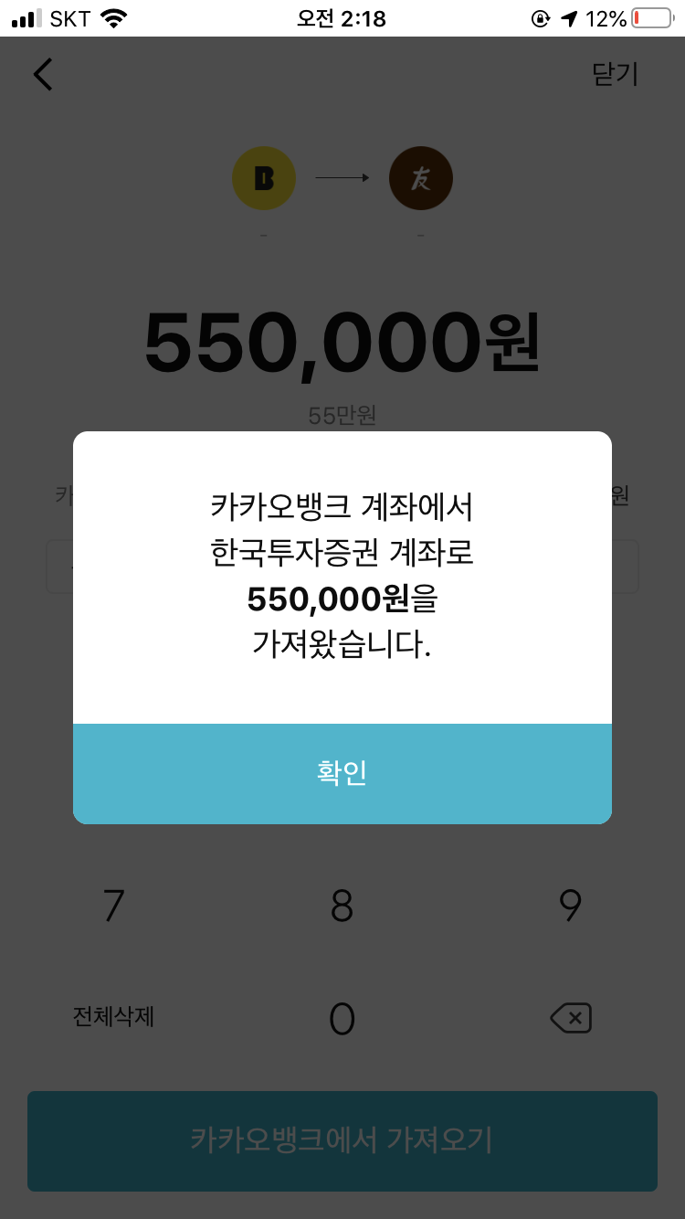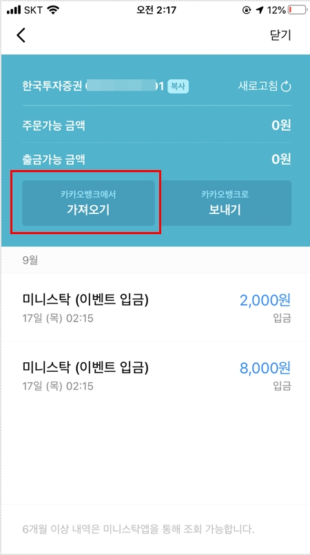 연결된 카카오 계좌에서 증권계좌로 가져오기를 해야해요. 가져오기 클릭