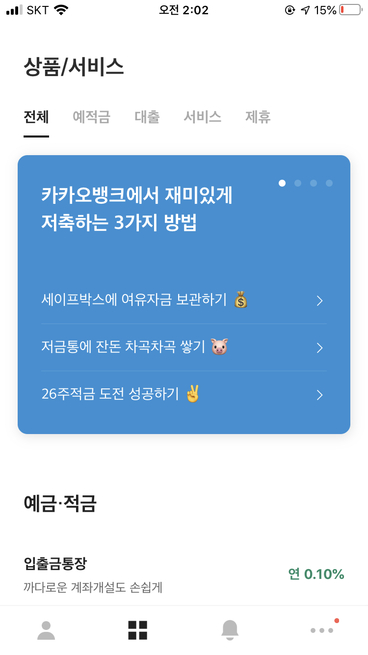 먼저 카카오뱅크에 들어가서 하단에 윈도우 모양 클릭하면 '상품/서비스' 메인화면을 옆으로 스크롤 넘겨보면