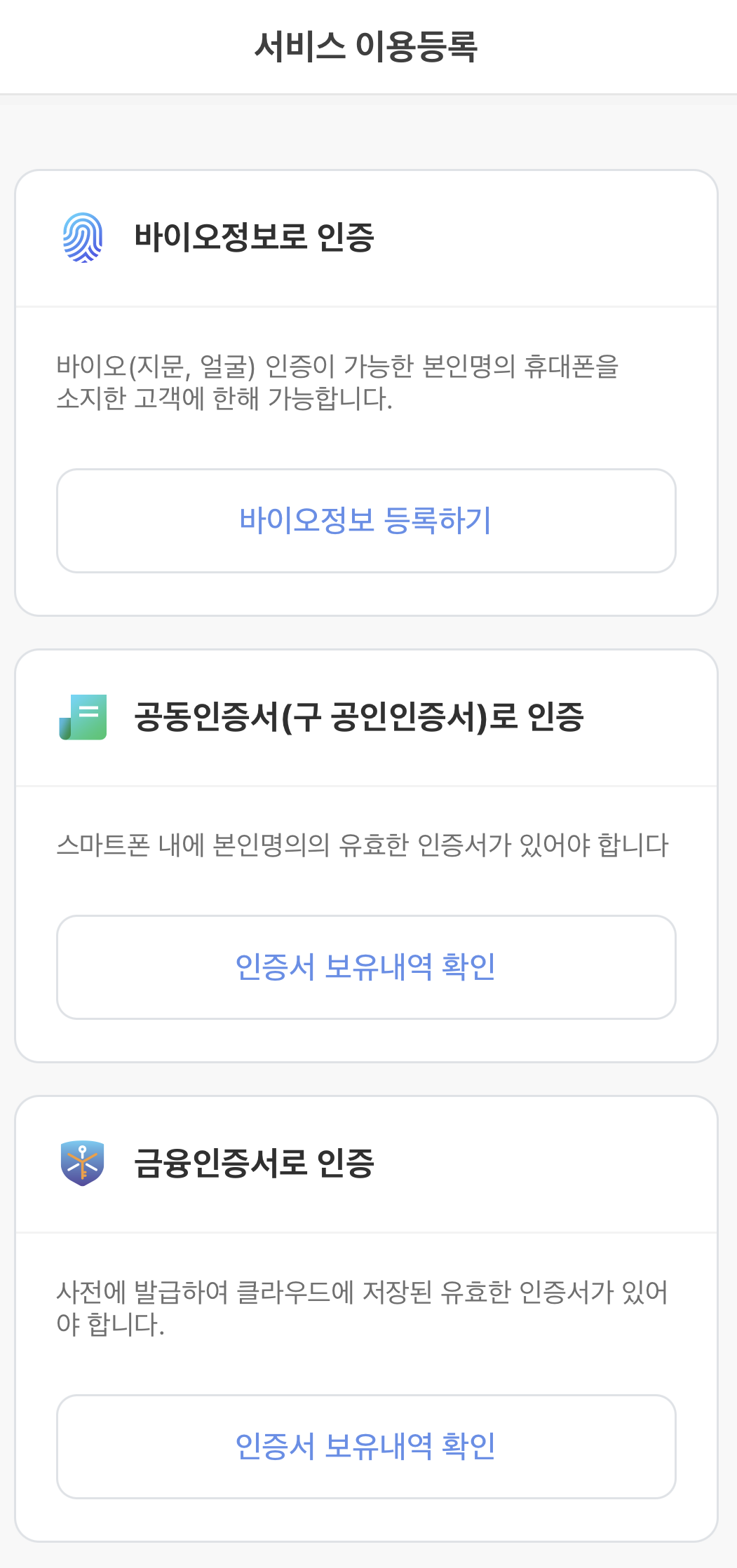 2. 로그인 절차 중 편하신 인증으로 등록해주세요. (공동인증서, 바이오정보, 금융인증서 가져오기)