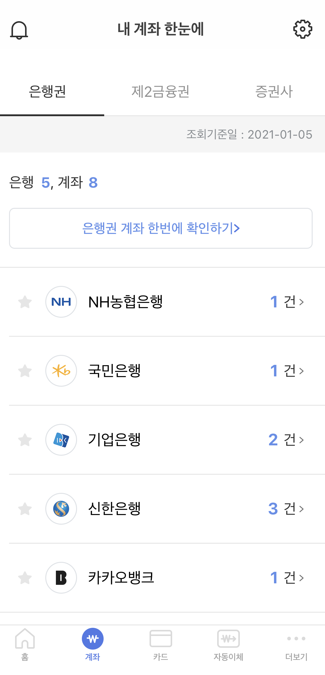3. 로그인 후 자주쓰는 계좌 선택 후 조회 > '내 계좌 한눈에' 클릭