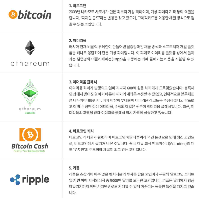최초의 가상화폐인 비트코인, 주요 가상화폐 5가지, 그리고 각 코인의 독특한 백서(Whitepaper)에 대해 알아보겠습니다.