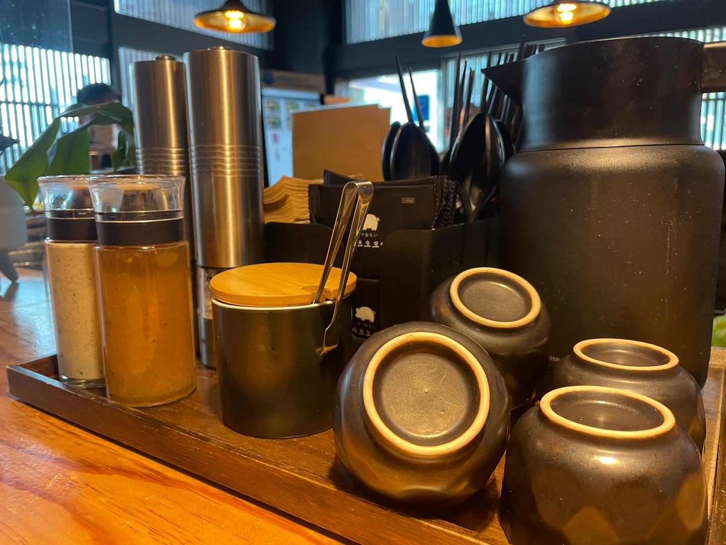 2인(?) 기준 좌석 앞에 준비되어있는 밑반찬과 식기구들 입니다.