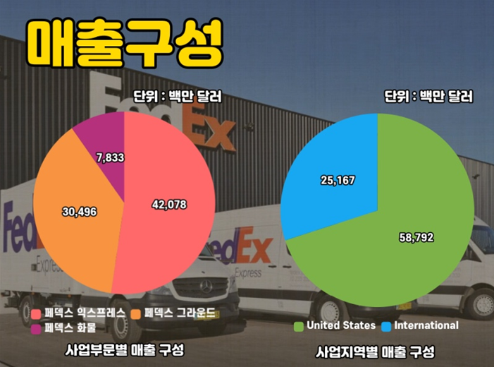 부문별 사업 매출을 살펴보면 FedEx Express는 항공 및 국제 배송을 제공하는 특송 서비스를 말하며, FedEx Ground는 FedEx Express보다 저렴한 비용으로 캐나다와 미국으로 육로를 배송하는 패키지 서비스를 의미합니다.