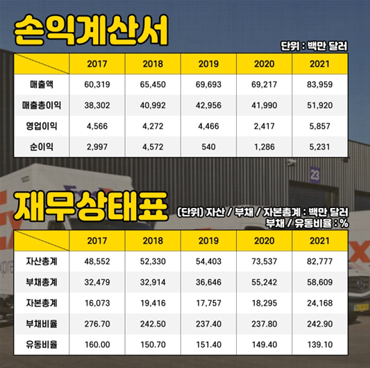 매출 및 영업이익 면에서는 2019년까지 꾸준히 증가하던 매출과 영업이익이 2020년 신종 코로나바이러스 영향으로 둔화되다가 2021년 큰 폭의 증가세를 보였습니다.