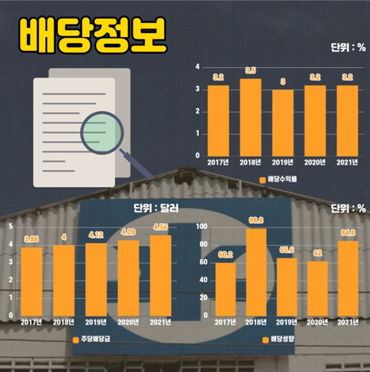 작년을 기준으로 배당수익률 3.2%, 주당배당금 4.56%, 배당 성향 84.8%이며 배당 성장을 50년 동안 해오고 있는 배당킹 기업입니다.