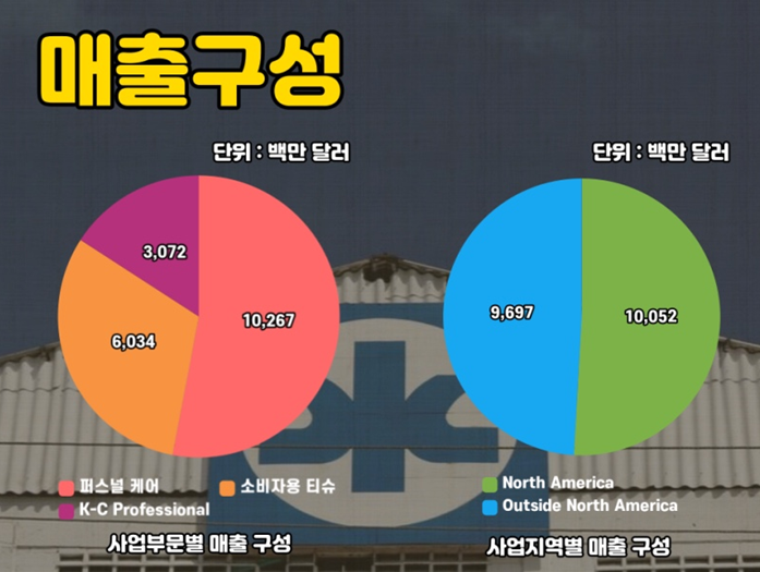 퍼스널케어 매출은 전체 매출의 53%를 차지했고 티슈, 케이씨 프로페셔널이 그 뒤를 이었습니다.
