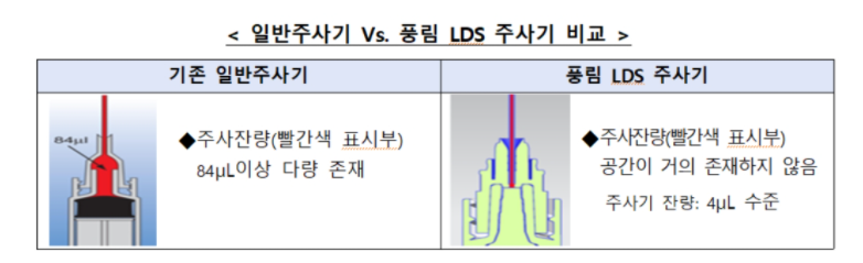 풍림 LDS 주사기는 미국 제약회사의 최소주사잔량 성능테스트를 통과했으며, 성능 요구 조건도 충족한 상태입니다.