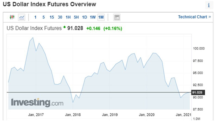 미국 달러 지수는 미국 달러를 ‘경제가 안정되거나 통화 가치가 안정적인’ 주요 6개국의 통화와 비교한 평균 지수입니다.