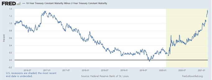 장단기 수익률 차이는 10년물 국채 수익률과 2년 물 국채 수익률의 차이를 나타내는 지표입니다.
