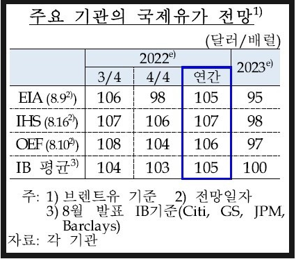 주요 기관들은 국제유가가 2분기에 고점을 찍고 2023년까지 점차 하락할 것으로 내다봤습니다.