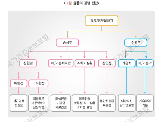 흉부나 턱 그리고 어깨 등 팔의 통증으로 나타내면서 전형적으로
