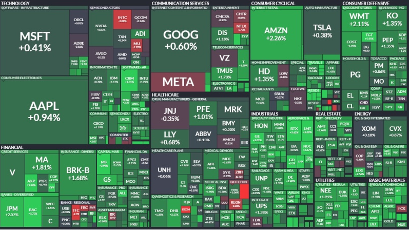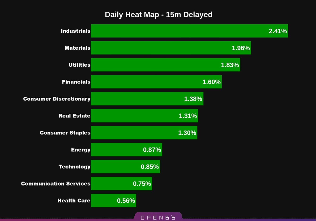 전반적으로 모든 업종, 특히 산업 및 소재 업종이 상승세를 보이며 강한 상승세를 보였습니다.