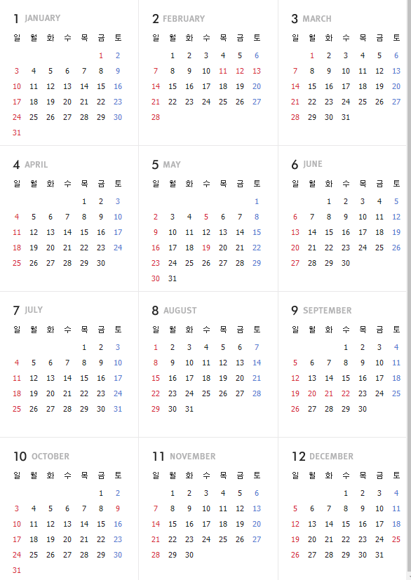 2021년 대부분의 공휴일은 주말에 있고, 평일 기준 빨간날은 총 9일로 약간 아쉬움이 밀려오네요.