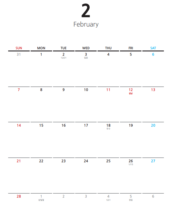 | 2월 | 12일 금요일 설날 (11日 목요일 - 13日 토요일) |