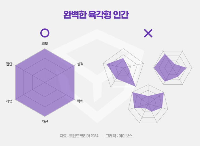 그래서 내가 네 가지를 갖췄더라도 두 가지를 못 받쳐서 육각형이 되지 않으면 내가 그래서 연애를 결혼을 못하는구나라고 짐짓 포기해 버립니다.