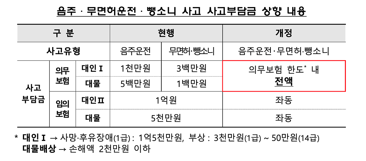 (음주운전:최대 1천5백만 원 → 최대 1억 7천만 원(1인당),의무보험 기준)