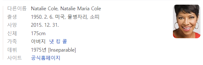 나탈리 콜은 유명한 재즈가수인 냇팅 콜의 딸입니다.